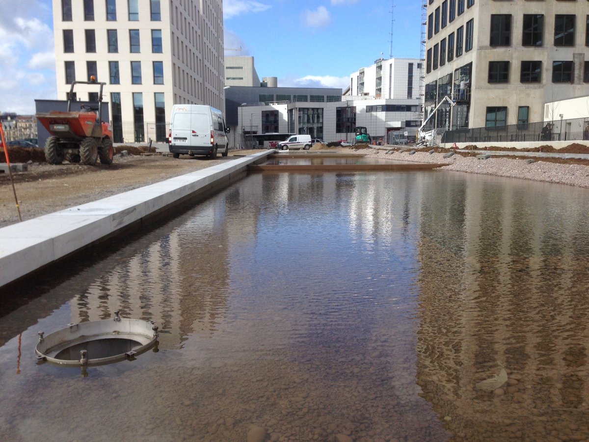 Dans le cadre de l'aménagement de l'éco-quartier Nancy Grand Cœur, une trame verte et bleue a été mise en place au sein d’ilots urbains. Quatre grands bassins en épuration naturelle renforcée (ENR) fonctionnent par paliers successifs jusqu'à la réserve d'eau de pluie située en point bas. Deux micro - forages viennent compléter les pertes éventuelles par évapotranspiration. L'ensemble de ce protocole mis au point par FC URBAN DESIGNER comprend les ensemencements bactériens, les faucardages saisonniers et les traitements anti algues biologiques.