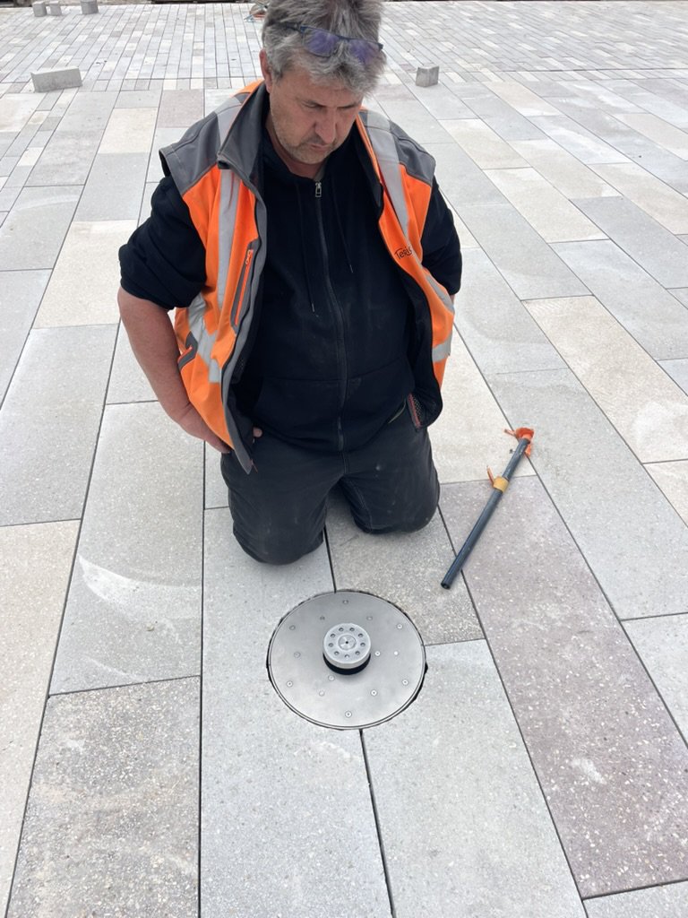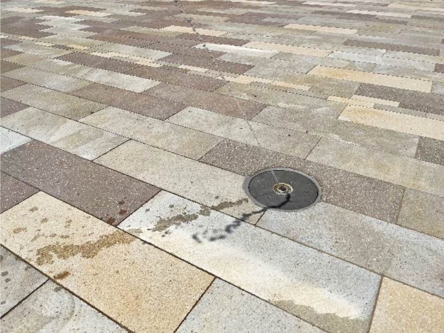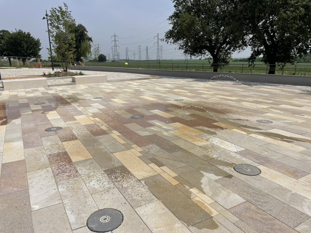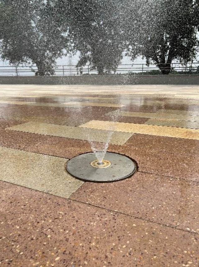 Création d’une fontaine ludique et scénographique, intégrant des jets animés et de la brumisation.